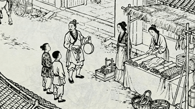 分镜 4:村口集市雏形,货郎挑着担子摇着拨浪鼓,几个孩童围着看热闹,妇人在旁驻足询问价格,摊位上摆着布匹和农具。