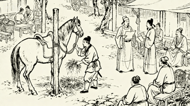 分镜 3:官道驿站,几匹骏马拴在木桩上,驿卒正给马匹喂料,两位信使手持文书匆匆交谈,背后有歇脚的商旅。