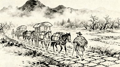 分镜 1:初春郊野,薄雾笼罩,远山含黛,一队驮运货物的骡马正沿石板路缓缓前行,赶车人披着蓑衣吆喝。