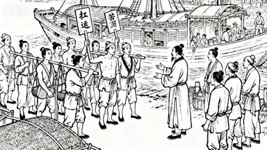 分镜 14:码头脚夫市场,数十位苦力聚集等待雇主,有人举着 “扛运” 木牌,工头拿着账簿点名分派活计,背景停靠着待卸货的商船。