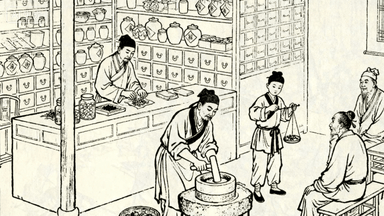 分镜 12:药铺柜台后,郎中正在碾药,药童按药方抓药称重,药柜上摆满贴着标签的药罐,几位病患坐在长凳上候诊。