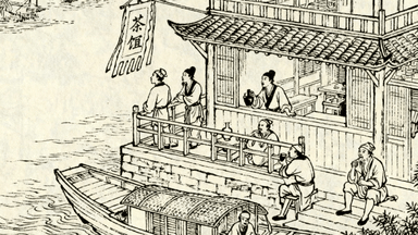分镜 6:河岸边茶馆酒肆,幌子迎风飘扬,客人在二楼凭栏远眺,小二端着酒壶穿梭席间,船工坐在石阶上歇脚饮酒。
