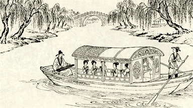 分镜 13:汴河游船,富家子弟在船舱内抚琴,歌女伴唱,船娘摇橹,两岸柳树依依,远处虹桥隐约可见,船篷雕花木窗精致。