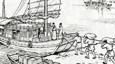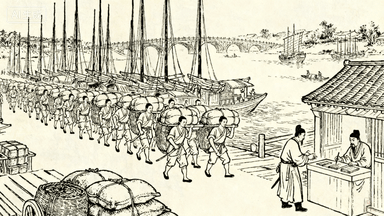 分镜 5:汴河码头,几艘漕船停靠岸边,纤夫弓着身子拉纤绳,脚夫扛着粮袋往来穿梭,管事站在船头清点货物。