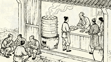 分镜 11:包子铺蒸笼冒着热气,伙计端着托盘给客人送包子,掌柜在柜台收钱,几位苦力蹲在门口捧着碗吃包子,蒸汽用虚线勾勒。