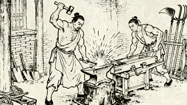 分镜 10:铁匠铺前,老铁匠抡着大锤打铁,火星四溅,学徒拉风箱鼓风,铁砧上放着待锻的农具,墙角堆着成品镰刀锄头。