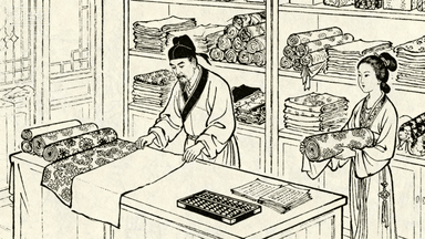 分镜 9:绸缎庄内,掌柜正用尺子丈量布匹,两位侍女捧着锦缎展示给富绅家眷,货架上堆叠着各色绫罗绸缎,柜台上算盘和账簿整齐摆放。