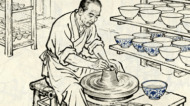 分镜 25:瓷器工坊,工匠正拉坯制陶,转盘飞速旋转,旁边架子上摆着待上釉的碗碟,老师傅用毛笔给瓷瓶画青花缠枝纹。