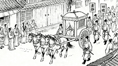分镜 17:州桥大街,四匹马拉的官轿正通过,轿夫步伐稳健,两侧差役手持 “肃静”“回避” 牌开路,行人纷纷避让,街边店铺门窗紧闭以示恭敬。
