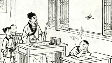 分镜 20:私塾内,先生手持戒尺端坐讲台,学童们摇头晃脑背书,一人打瞌睡被先生用粉笔头砸中,窗外有蜻蜓飞过。