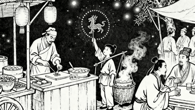 分镜 23:夜市小吃摊,灯笼高挂,摊主现做糖画,孩童举着糖人舔食,卖馄饨的挑子冒着热气,几位书生围坐矮桌饮酒论诗。