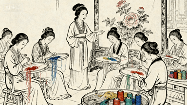 分镜 21:绸缎庄绣娘作坊,七八位绣娘围坐绣架前刺绣,各色丝线缠绕在绷子上,掌柜妇人巡视指点,成品屏风上牡丹图案栩栩如生。