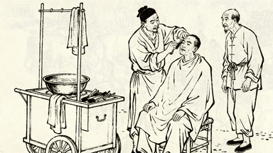 分镜 15:剃头挑子旁,理发师正给顾客刮脸,另一人坐在凳上等待,挑子一头是热水铜盆,另一头是工具箱,墙上挂着毛巾。