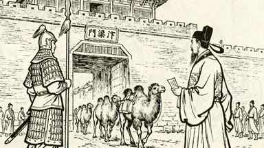 分镜 24:城门守卫,士兵身披铠甲手持长矛站岗,城门官查验通关文牒,商旅赶着骆驼队进城,城门洞上方刻有 “汴梁门” 匾额。