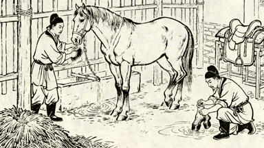 分镜 22:官驿马厩,马夫给骏马刷毛,兽医检查马蹄,几匹驿马拴在石槽边饮水,远处驿卒正备鞍,墙角堆着草料。