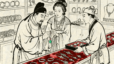 分镜 18:珠宝行柜台,掌柜用镊子夹起玉佩展示给富商,夫人用放大镜细看,学徒捧着首饰盒侍立,货架陈列玉镯、金钗,柜台铺红绒布。