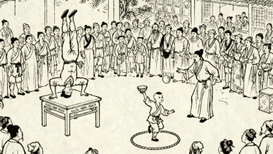 分镜 19:杂耍表演,艺人倒立在叠起的八仙桌上,孩童钻圈,另一人抛接瓷碗,围观人群三层外三层,有人踮脚张望,有人拍手叫好。
