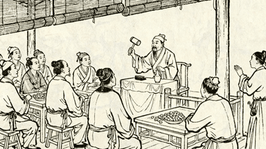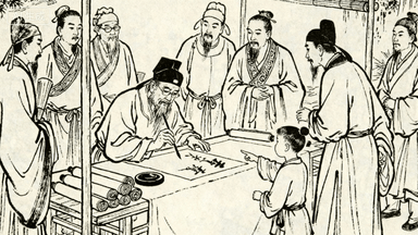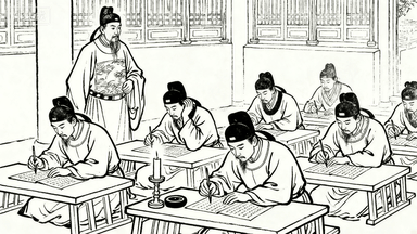 分镜 43:官学考试,考生在号舍内答卷,监考官巡视,有人抓耳挠腮,有人奋笔疾书,砚台磨墨,蜡烛燃至过半。