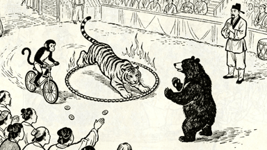 分镜 32:杂技班驯兽,艺人指挥猴子骑车,老虎钻火圈(火圈用虚线表现),黑熊站立作揖,观众扔铜钱打赏,班主拱手致谢。