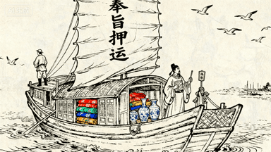 分镜 37:官船押运贡品,舱内堆满丝绸瓷器,押运官手持令牌巡视,水手站在船舷瞭望,船帆上写着 “奉旨押运”,水面鸥鸟追随。