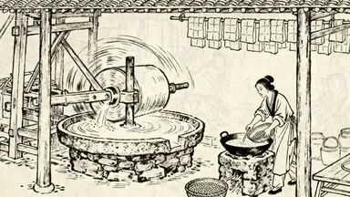 分镜 31:豆腐坊,磨盘转动,豆浆顺着石槽流下,主妇用布包滤豆渣,灶台铁锅煮豆浆,屋檐下挂着豆腐干。