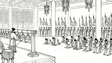 分镜 35:皇家祭祀彩排,太常寺官员带领乐师调试编钟,礼生演练跪拜礼,旌旗仪仗排列整齐,太庙屋檐下挂着祭祀礼器。
