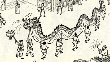 分镜 36:民间舞龙,二十人抬着布龙穿梭街巷,龙头高昂喷水(水线用虚线),孩童举灯笼跟随,商铺掌柜点燃鞭炮助兴。
