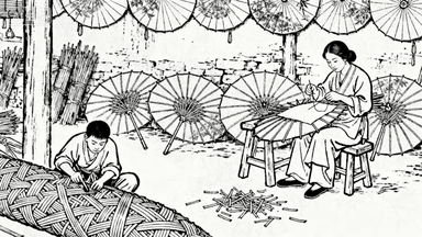 分镜 29:制伞作坊,工匠用竹篾扎伞骨,妇人缝伞面,成品油纸伞挂满墙壁,学徒给伞面刷桐油,地面散落竹屑。