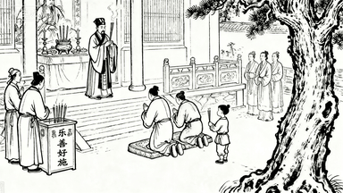 分镜 28:道观祈福,道士焚香诵经,香客跪拜神像,孩童在香炉前插香,功德箱上贴 “乐善好施”,院中古柏苍劲。