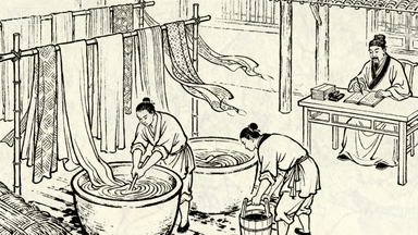分镜 26:绸缎庄染坊,工人将布匹放入染缸搅拌,晾晒的彩色绸缎在竹竿上随风飘动,掌柜记录染色批次,学徒搬运染料桶。