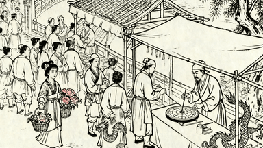 分镜 34:虹桥集市,商贩占道搭棚,卖花姑娘篮中插满牡丹芍药,糖画艺人捏出龙凤造型,算命先生罗盘转动,人群摩肩接踵。