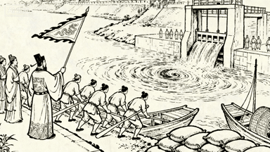 分镜 33:汴河漕运指挥,官员站在高台挥动令旗,漕工们协调推拉船只过闸,闸门缓缓升起,水面泛起漩涡,岸边堆放漕粮麻袋。