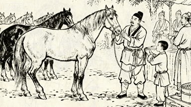 分镜 30:马市交易,马贩牵着骏马展示给买家,兽医掰开马嘴看牙口,孩童躲在大人身后摸马鬃,背景有骡马成群。