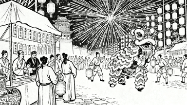 分镜 39:元宵灯会,游人手提走马灯,猜灯谜摊位前聚集文人,宫灯上绘着历史典故,舞狮队伍穿过灯海,烟花用放射状线条表现。
