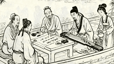 分镜 41:画舫雅集,文人墨客在汴河画舫上题诗作画,案几铺展宣纸,一人挥毫写《清明上河图》观后感,琴师弹奏古筝,侍女烹茶。