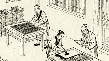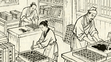 分镜 38:书坊刻书,雕版工匠执刀在梨木版上刻字,学徒刷墨拓印,书架摆满线装书,掌柜正在装订《论语》,墙角堆着待售书册。