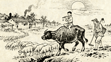 分镜 48:黄昏归牧,牧童骑牛吹笛,牛羊群沿着田埂返村,农夫扛锄头回家,炊烟从农舍升起,夕阳用圆形轮廓表现。
