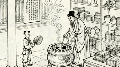 分镜 46:道观炼丹,道士用八卦炉炼丹,童儿扇风,丹房摆满药罐与古籍,炉顶青烟袅袅(虚线表现),墙上挂《黄帝内经》挂图。