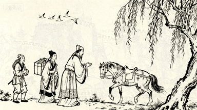 分镜 40:城外送别,亲友在长亭摆酒饯行,书生抱拳作揖,仆从挑着书箱等待,柳枝依依,远处驿马扬蹄而来,天空雁阵南飞。