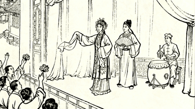 分镜 44:戏曲舞台,旦角甩水袖表演《西厢记》,生角持折扇对唱,台下观众抛鲜花,戏班班主在后台敲锣打鼓。