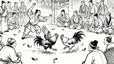 分镜 47:市井斗鸡,两只公鸡激烈相斗,主人在旁呐喊助威,赌徒举着铜钱下注,围观者屏息观看,地面鸡毛散落。