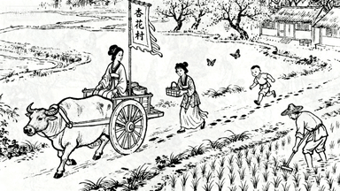 分镜 42:郊外踏青,仕女们乘牛车春游,丫鬟捧着食盒,孩童追逐蝴蝶,路边酒肆挂 “杏花村” 酒旗,农夫在田间插秧。