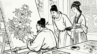分镜 51:宫廷画院写生,画师们在御花园临摹牡丹,徽宗皇帝驻足指点,宫女捧砚侍立,画案上摆着《宣和画谱》。