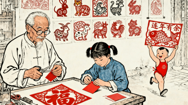 分镜 52:民间剪纸作坊,老艺人剪 “福” 字窗花,学徒用红纸折叠,墙上贴满生肖剪纸,孩童举着 “连年有余” 剪纸嬉戏。