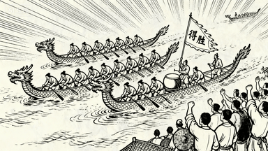 分镜 56:龙舟竞渡,汴河上五艘龙舟奋力向前,桨手动作整齐划一,鼓手擂鼓助威,岸边观众呐喊,旗手挥舞 “得胜” 旗。