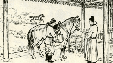 分镜 53:驿站换马,驿卒卸下公文袋换乘快马,马夫给马匹上鞍,站长核对文书,远处尘烟中另一驿马奔来。