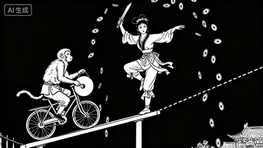 分镜 54:庙会杂耍,艺人表演吞剑,女子走钢丝(用虚线表现平衡木),猴子骑车敲锣,观众席抛铜钱如雨。