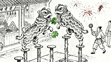 分镜 50:舞狮采青,双狮踩着梅花桩争夺高悬的生菜,驯狮人手持绣球引导,围观者燃放鞭炮,商铺门口摆着贡品。