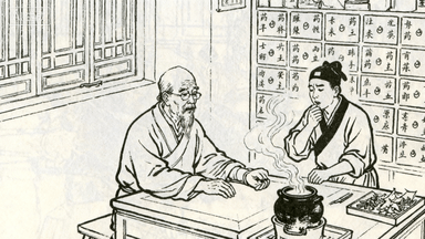 分镜 55:中医馆问诊,老中医搭脉诊病,患者咳嗽捂胸,药童按药方抓药,药柜抽屉标满药名,砂锅煎药冒热气。